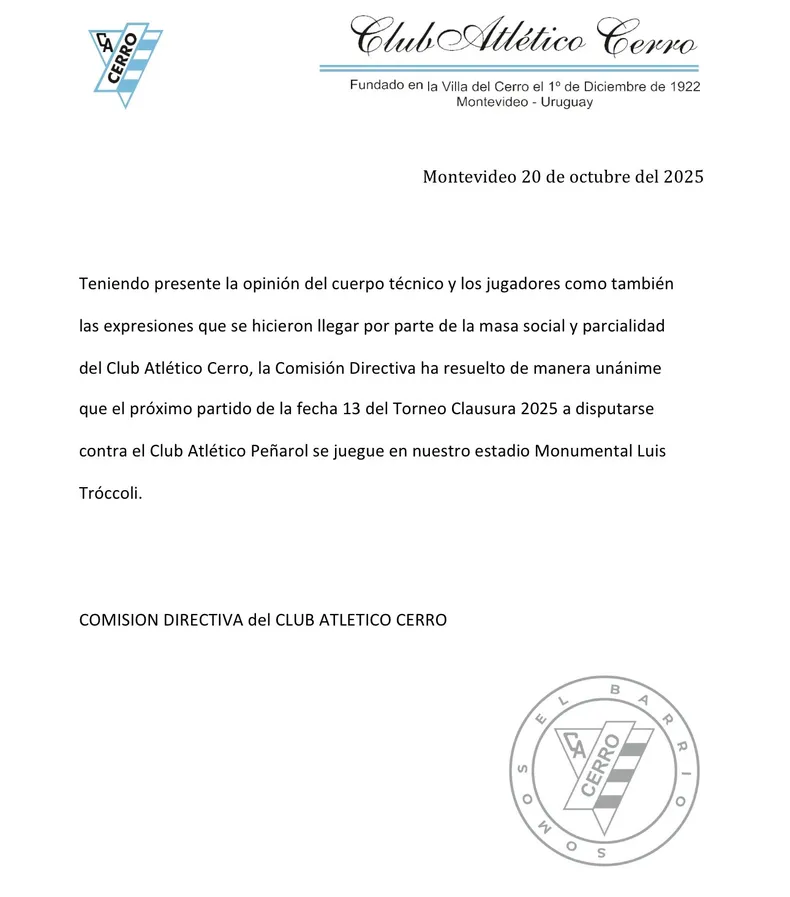 El Club Atlético Cerro resolvió este lunes que el partido por la 13ª fecha del Torneo Clausura ante Peñarol se juegue en su cancha, el estadio Monumental Luis Tróccoli, y no en el Estadio Centenario, como era intención del conjunto mirasol.