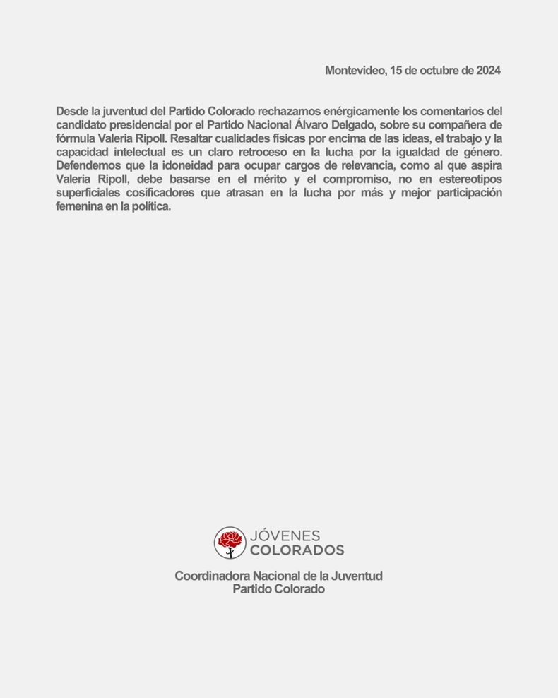 La Coordinadora Nacional de la Juventud del Partido Colorado emitió un comunicado rechazando los dichos de Álvaro Delgado sobre Valeria Ripoll, a quien consideró «un bombón» durante un acto político ocurrido el pasado fin de semana.