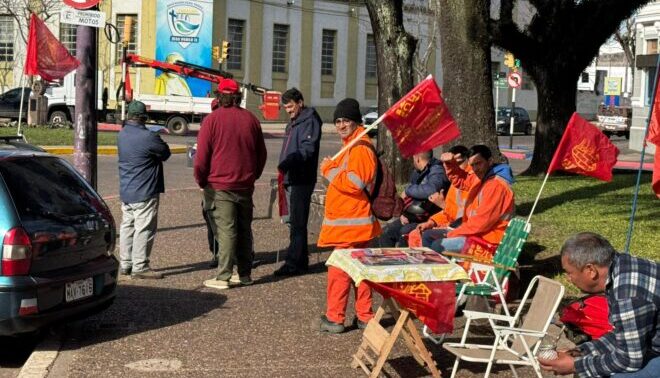 En la mañana del 12 de agosto, la Plaza Batlle de la ciudad de Artigas fue escenario de una nueva movilización sindical. Representantes del Sindicato Único Nacional de la Construcción y Anexos (SUNCA) participaron activamente en el paro general de 24 horas decretado por la Mesa Representativa del PIT-CNT.